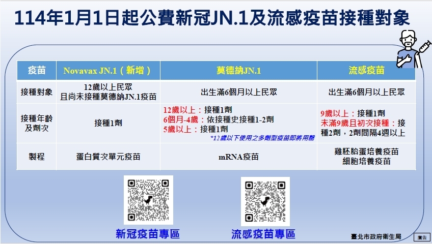 114年1月1日起流感疫苗擴大全國6個月以上尚未接種民眾,新冠Novavax疫苗開打對象為12歲以上尚未接種JN.1民眾,請洽合約醫療院所接種。