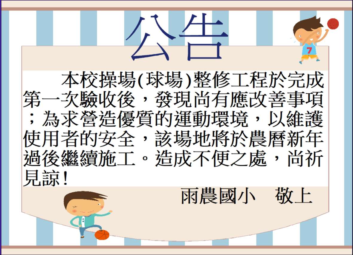本校操場(球場)整修工程於完成第一次驗收後,發現尚有應改善事項;為求營造優質的運動環境,以維護使用者的安全,該場地將於農曆新年過後繼續施工。造成不便之處,尚祈見諒!