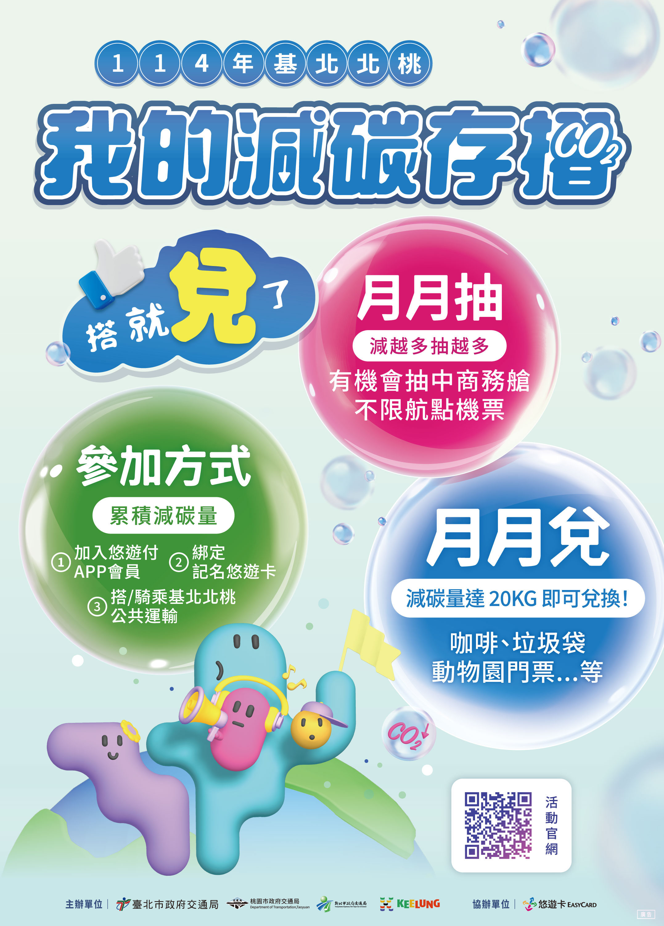 為攜手市民多加使用公共運輸,以朝淨零碳排目標前進, 由政府、企業一起帶動全民綠運輸減碳,113年由基北北桃 四市交通單位、公共運輸業者及悠遊卡股份有限公司共同 推動,114年度擴大辦理並增加兌獎制活動,民眾累積達一 定減碳量即可登錄兌換獎項,提高民眾參與誘因,活動辦 理期間自114年1月1日至12月31日止,詳細內容可至本活動 官網查閱114年活動資訊(https://co2- passbook.com /)。
