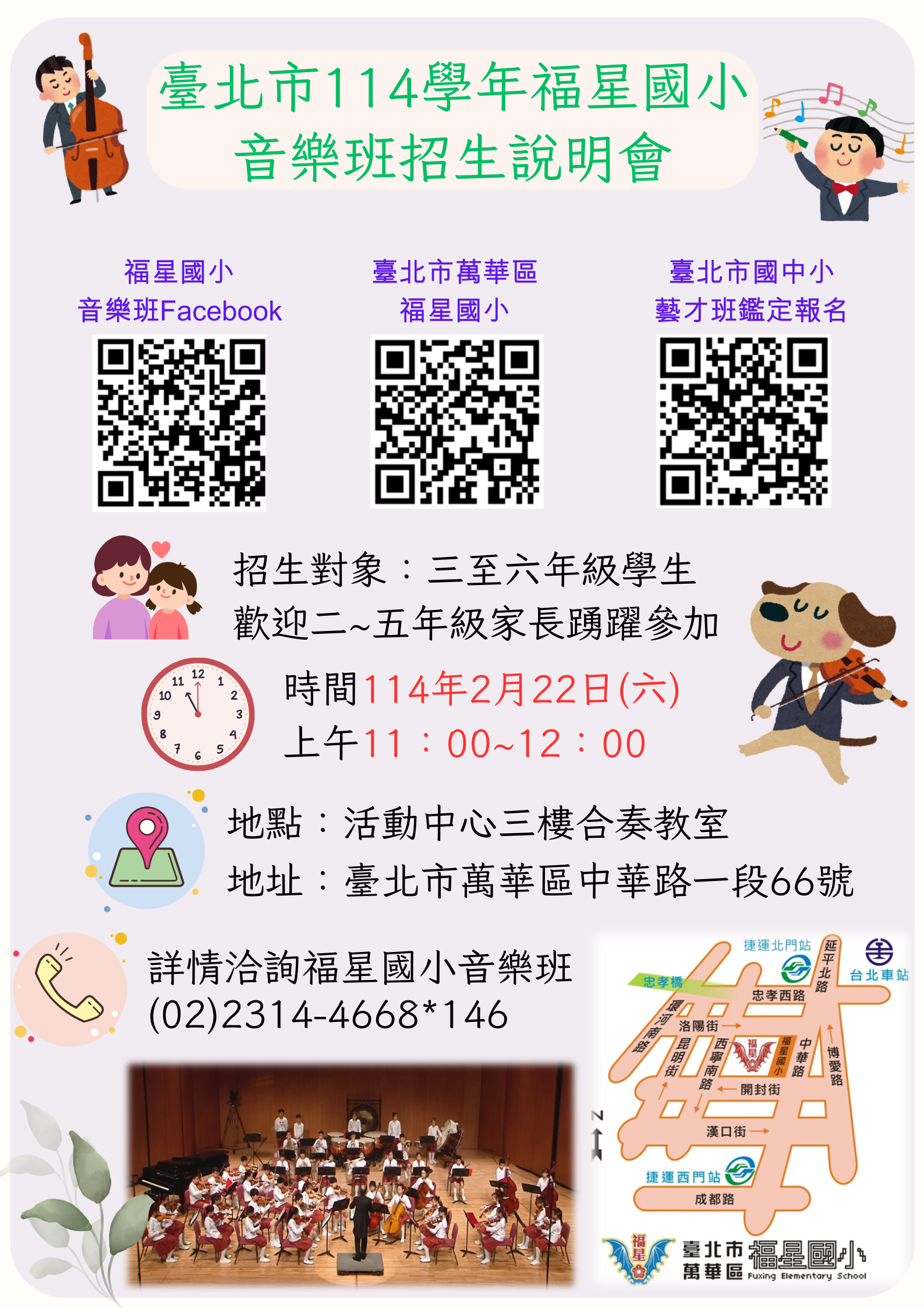 (二)地點:臺北市福星國小(114學年度承辦學校)學生活動中心三樓合奏教室。(臺北市萬華區中華路一段66號,捷運北門1號出口站或西門町6號出口)