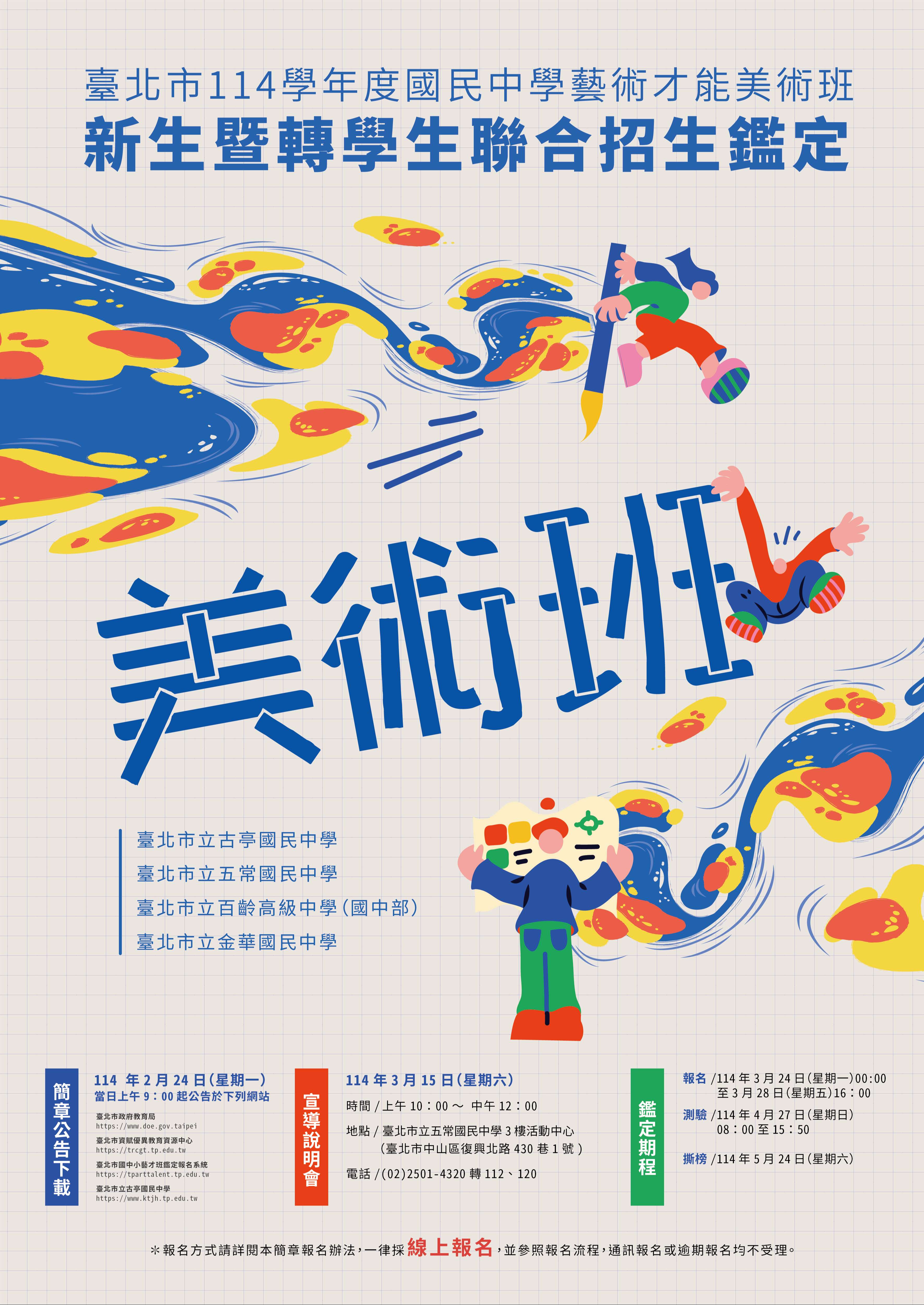 一、期程:114學年度招生鑑定報名自114年3月24日(星期一)0:00至3月28日(星期五)16:00,3月15日宣導說明會,4月27日測驗,5月24日撕榜,詳情請參閱附件資訊。