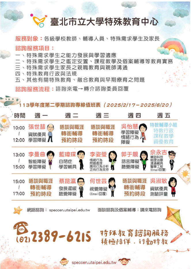 臺北市立大學特殊教育中心113-2諮詢服務訊息,歡迎教師、家長們參考!