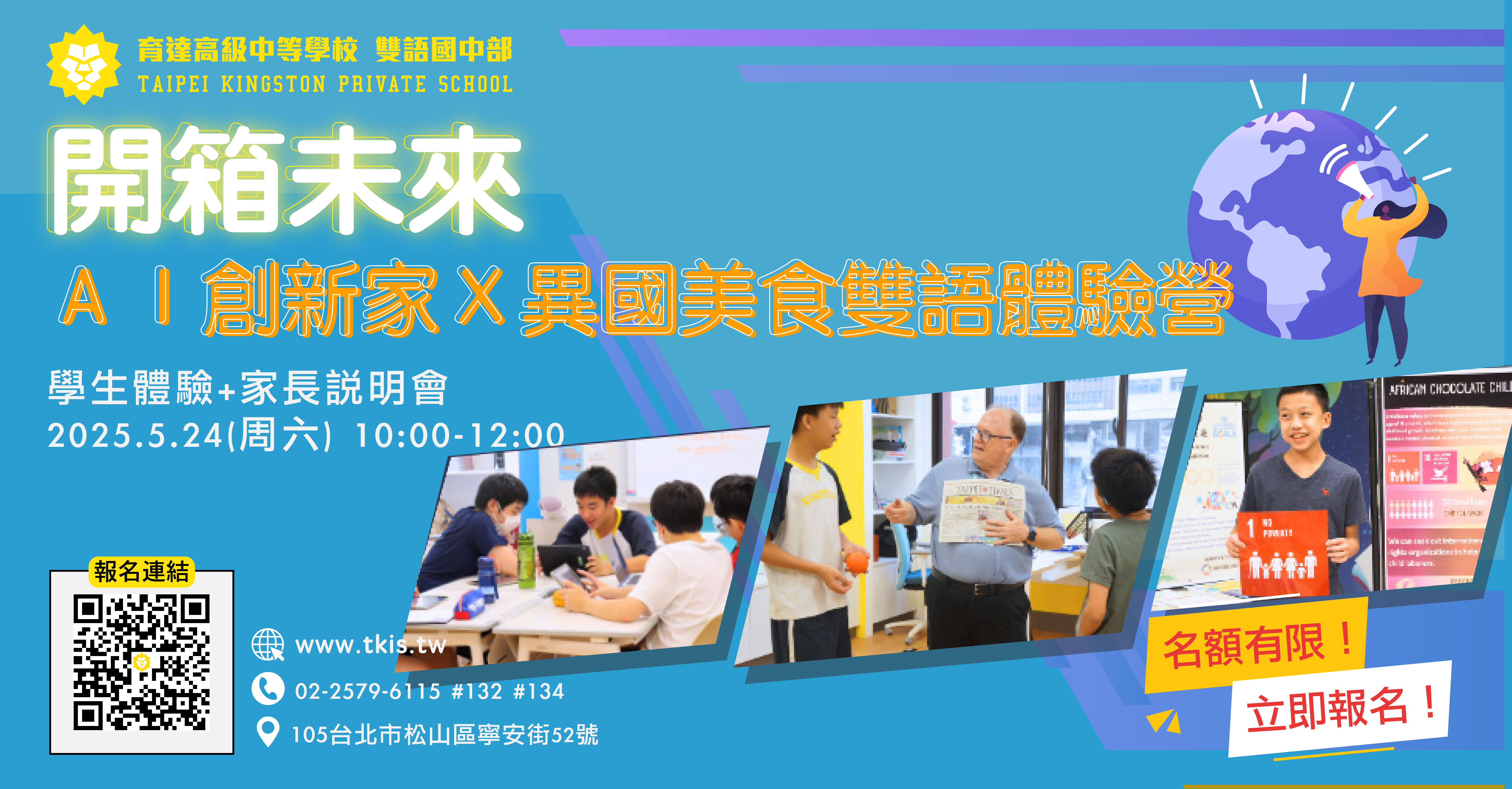 中學習如何以地球永續的概念,結合AI科技趨勢,設計未來產品,外師分享異國美食文化,打開國際觀!我們也在同一時間安排入學說明會,深入介紹我們的課程規劃與環