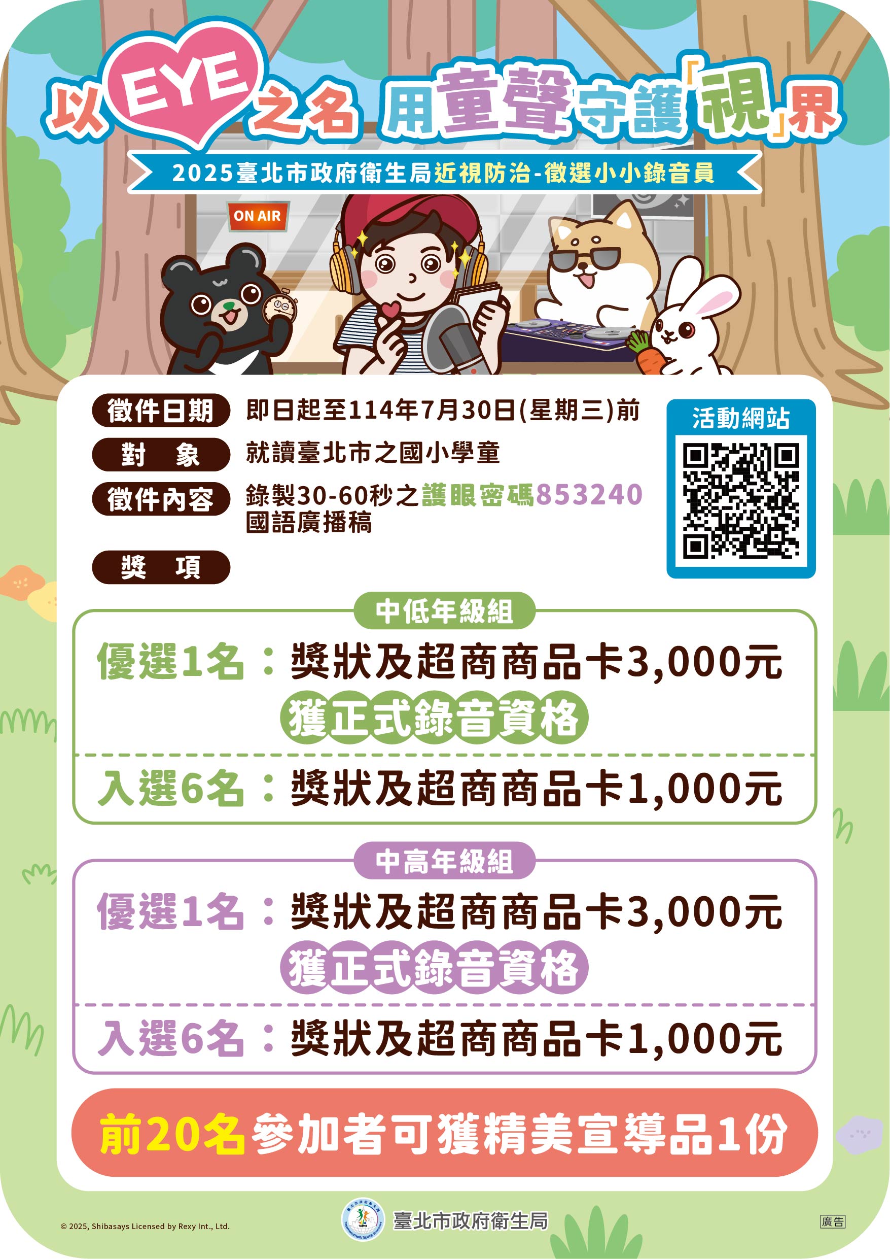 二、為鼓勵家長帶孩子進行「護眼護照檢查」及推廣「護眼密 碼-853240」,特委託雷科斯國際有限公司辦理旨揭活動, 簡章內容摘述如下: (一)對象:就讀本市公私立國小學童(參選年級以114年6 月 份就讀之學籍為準)。(二)報名方式及徵件期間:採線上報名(網址: https://forms.gle/RXLJgu6b2zE7gDzQ6),即日起至 114 年7月30日止。 (三)分組年級: 1、中低年級組:1-3年級。 2、中高年級組:4-6年級。 (四)作品規格:錄製30-60秒指定廣播稿內容,上傳MP3 或 WAV檔,不限錄製工具,平板、手機、相機、錄音機等器 材。 (五)評分標準:邀請專業配音員擔任評審委員,就口條清晰 度(30%)、發音及音質特色(25%)、語調創意及渲染 力(25%)及節奏與穩定度(20%)等標準進行評選。 (六)獎項規劃: 1、中低年級組: (1)優選1名:獎狀1只,超商商品卡新臺幣3,000元, 並獲得正式參與錄音資格。 (2)入選6名:獎狀1只,超商商品卡新臺幣1,000元。 2、中高年級組: (1)優選1名:獎狀1只,超商商品卡新臺幣3,000元, 並獲得正式參與錄音資格。 (2)入選6名:獎狀1只,超商商品卡新臺幣1,000元。