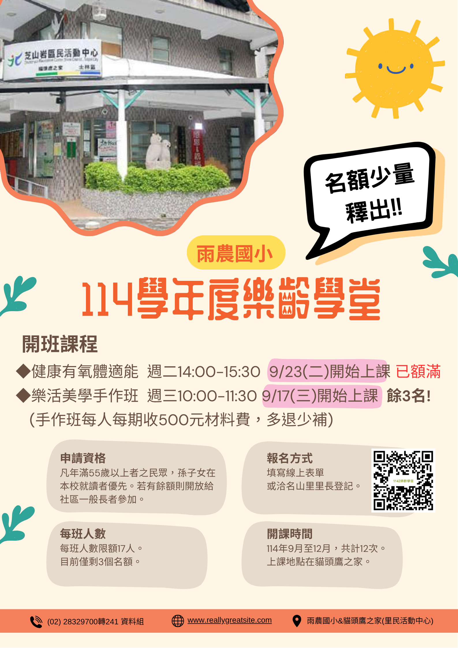 114年度第二期雨農樂齡學堂招生,詳細資訊請見海報與報名表單,歡迎來電洽詢。