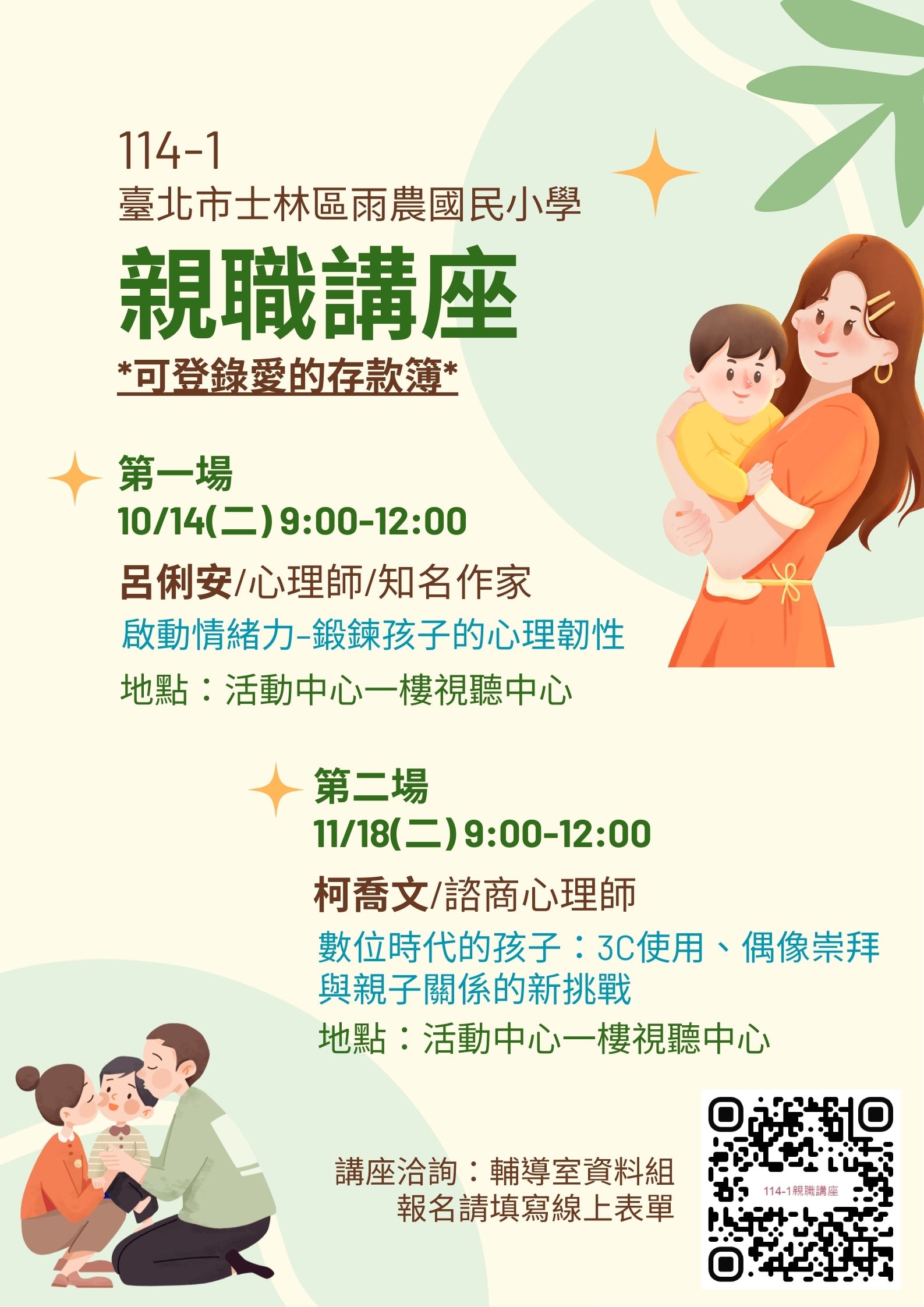 臺北市士林區雨農國民小學親職講座(10、11月),堅強陣容,不容錯過。
