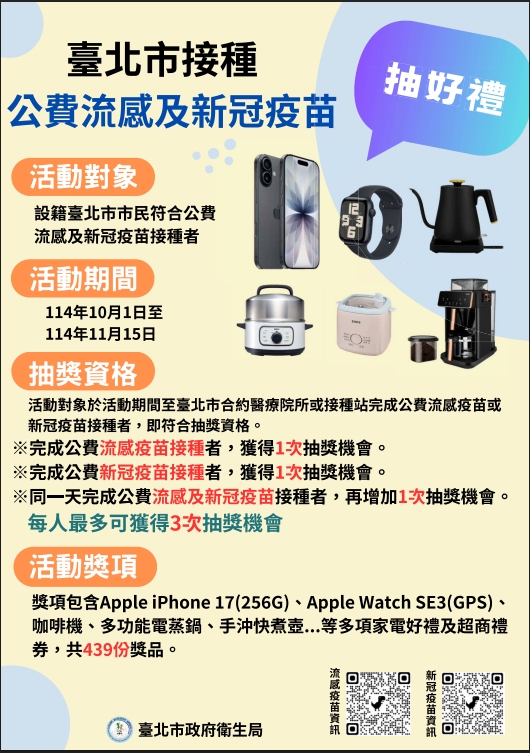 凡設籍臺北市市民符合公費流感及新冠疫苗接種者於114年 10月1日至11月15日期間,於本市合約醫療院所或接種站完 成公費流感疫苗或新冠疫苗接種者,即符合抽獎資格。活 動期間共辦理2次抽獎,第1次抽獎未獲獎名單併入第2次抽 獎,得獎名單將分別於114年11月5日前及11月25日前公告 於本局官網。