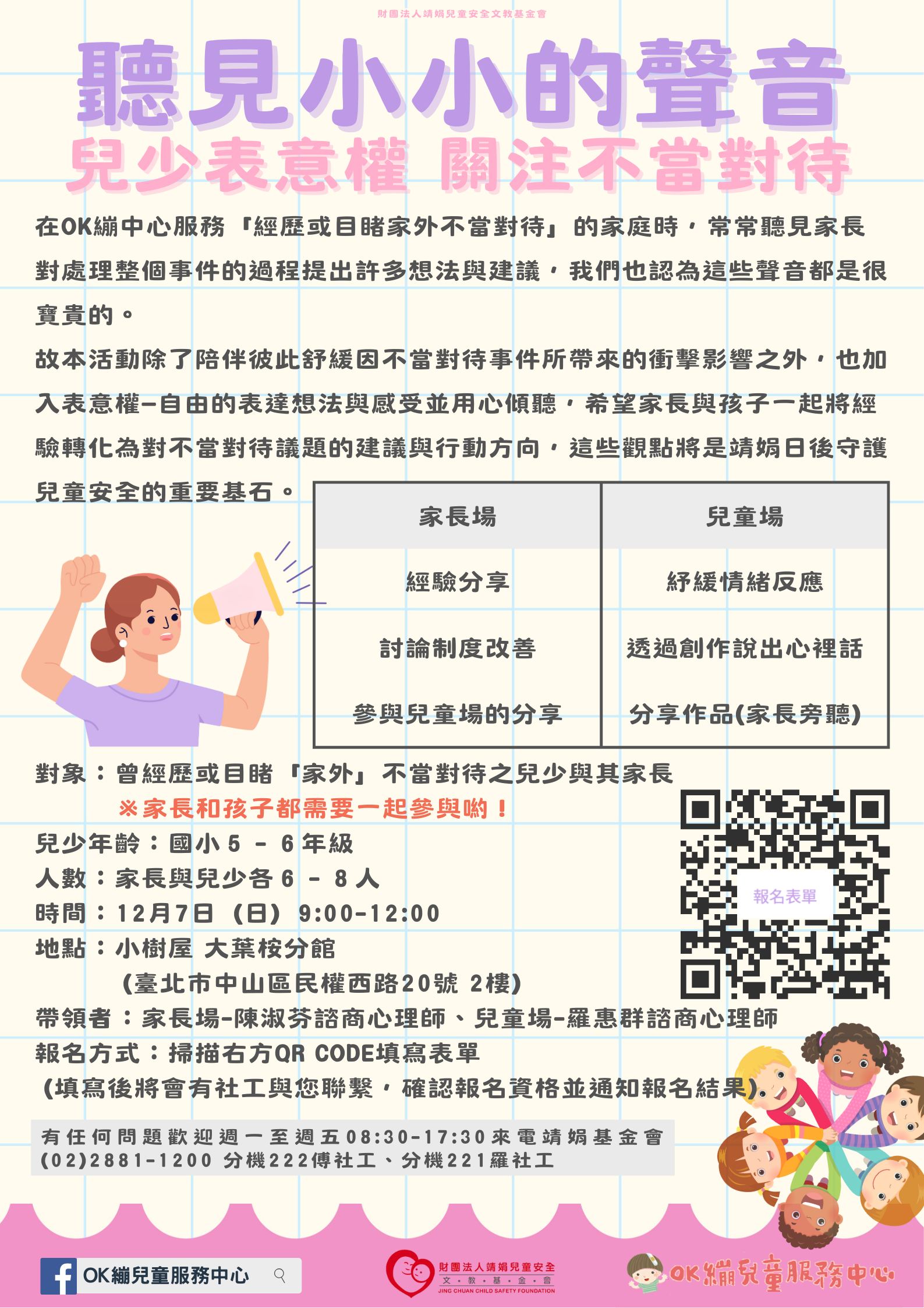 三、綜上,該會將以「家外不當對待」為活動主題,邀請曾經歷或目睹不當對待之家長及兒少共同參與,期協助本市各國小家長及兒少凝聚意見與想法並討論現行不當對待相關制度可 改善之處,透過家長與兒少之聲音,將成為推動不當對待相關議題持續進步的重要力量。