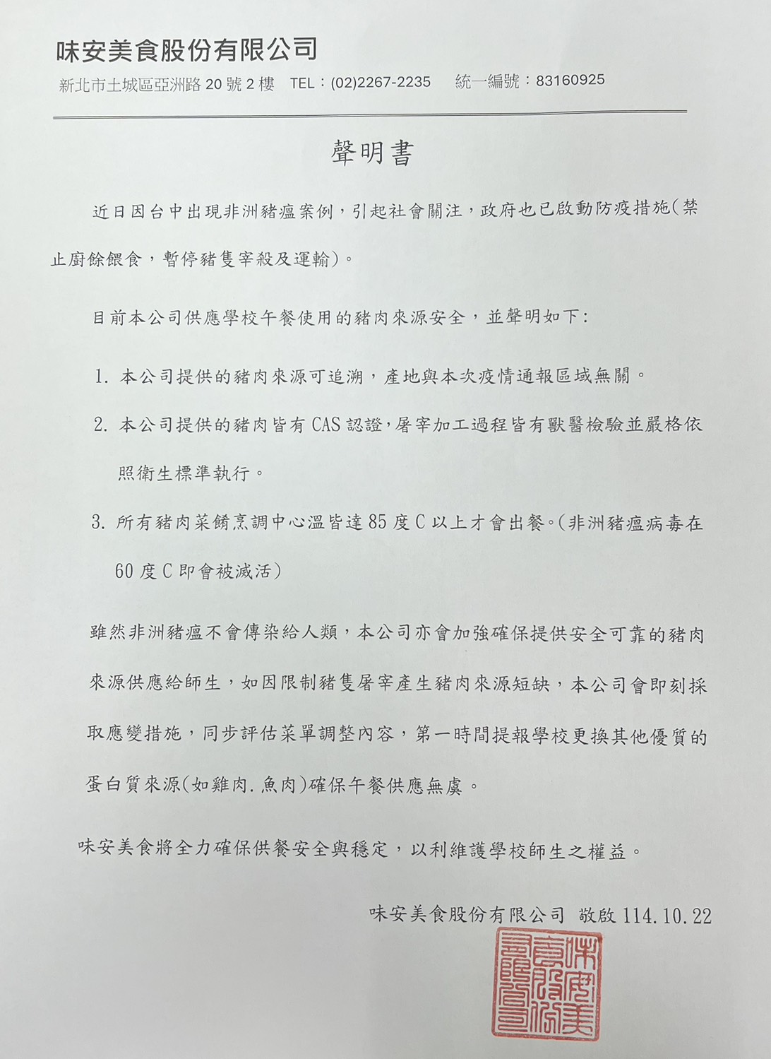 本校配合之營養午餐廠商嚴格把關營養午餐食材來源,使用於營養午餐的豬隻及其製品皆非來自非洲豬瘟疫區,請全體師生及家長安心。將持續配合政府相關檢驗與把關機制,確保食材來源合法與安全無虞。