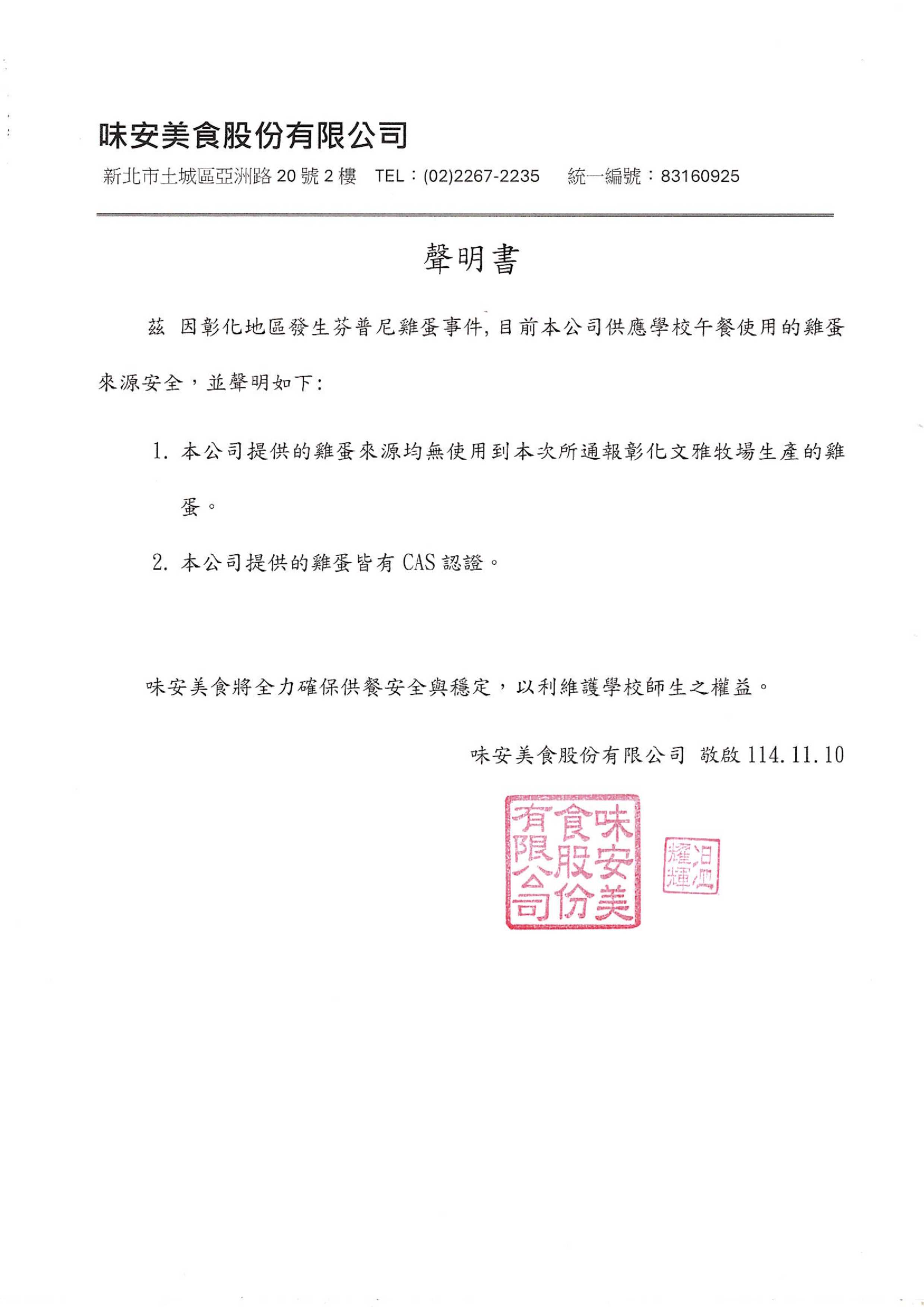因應彰化地區發生芬普尼雞蛋事件,故提供味安公司所發之聲明書及雞蛋供應商之聲明書,本校所屬劍潭群組所使用之雞蛋,來源皆無本次所通報的彰化文雅牧場生產,味安美公司將全力確保供餐安全與穩定,以利維護學校師生權益。