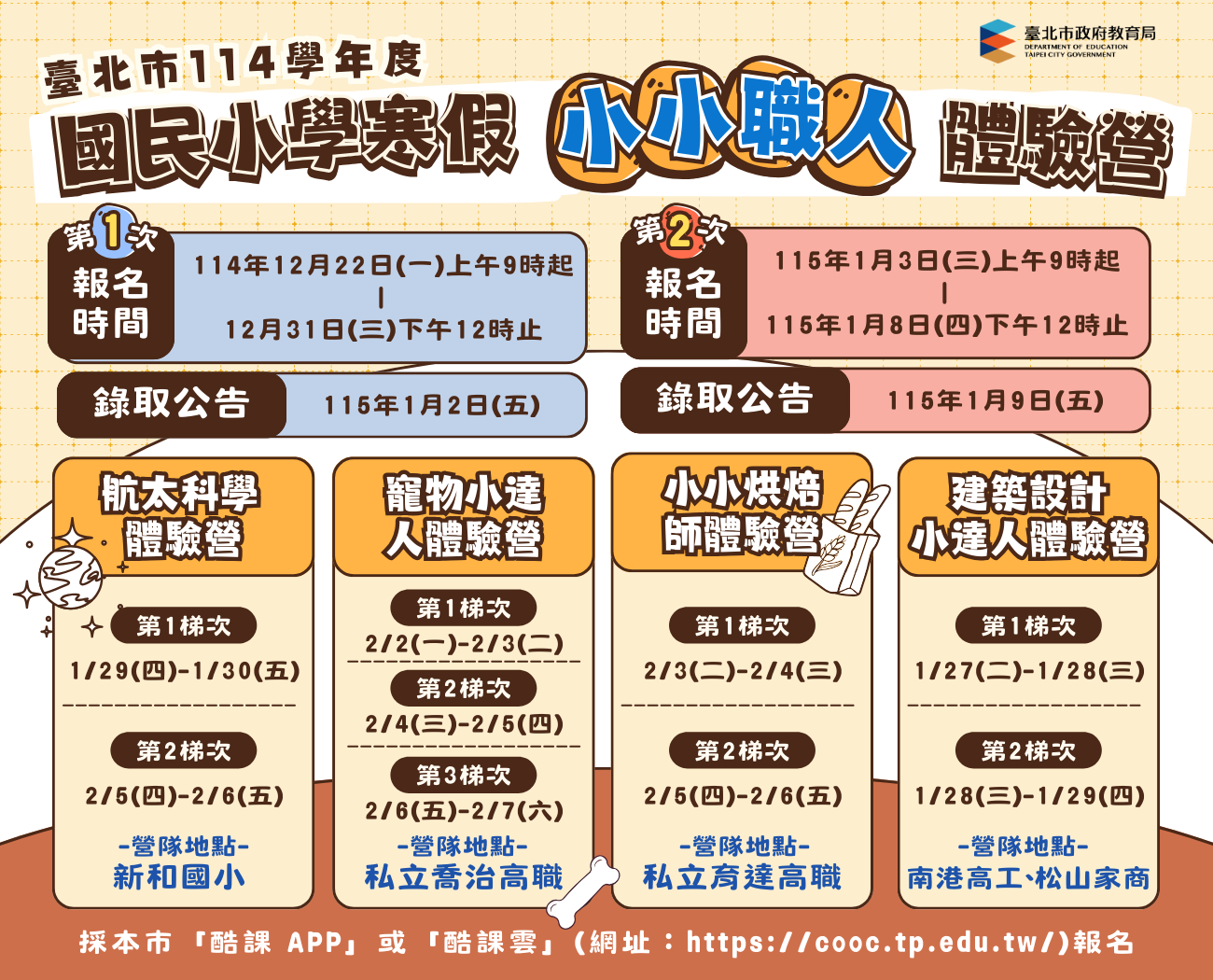 (活動資訊)臺北市114學年度國民小學寒假小小職人體驗營