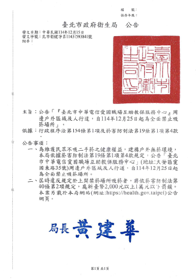 二、為維護民眾不吸二手菸之健康權益,建構戶外無菸環境, 本局依據菸害防制法第19條第1項第4款規定,公告「中華 電信愛國職場互助教保服務中心」(地址:大安區愛國東路 35號)周邊戶外區域及人行道,自114年12月25日起為全面 禁止吸菸場所。