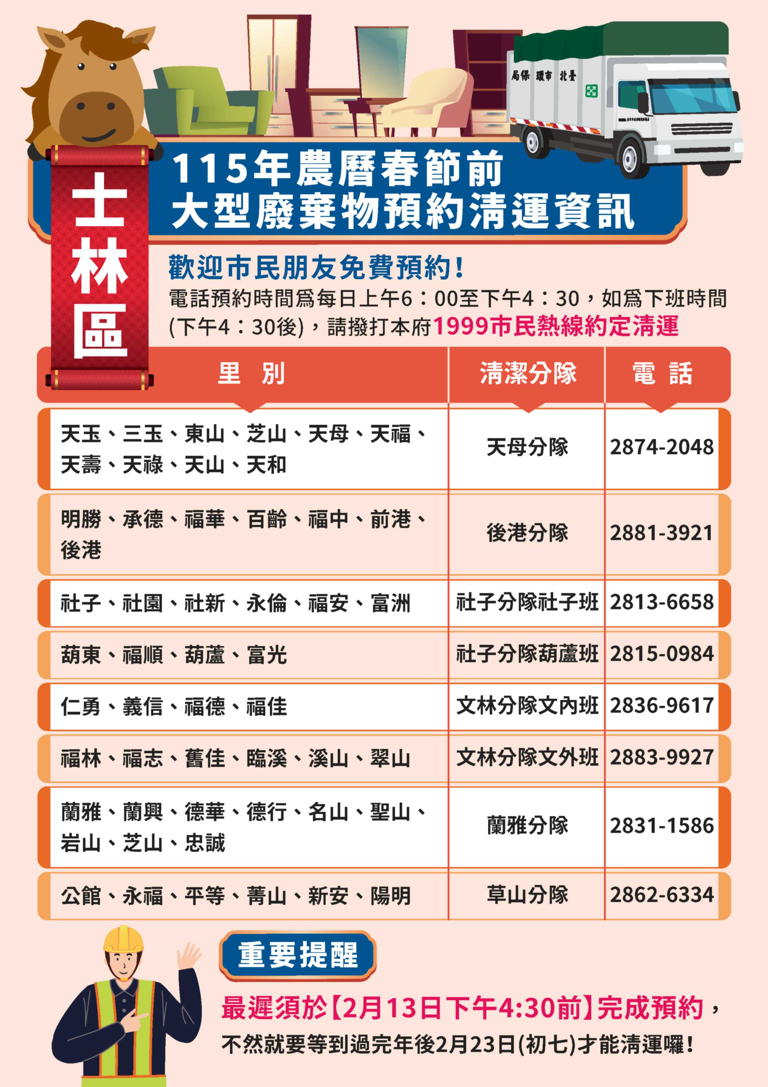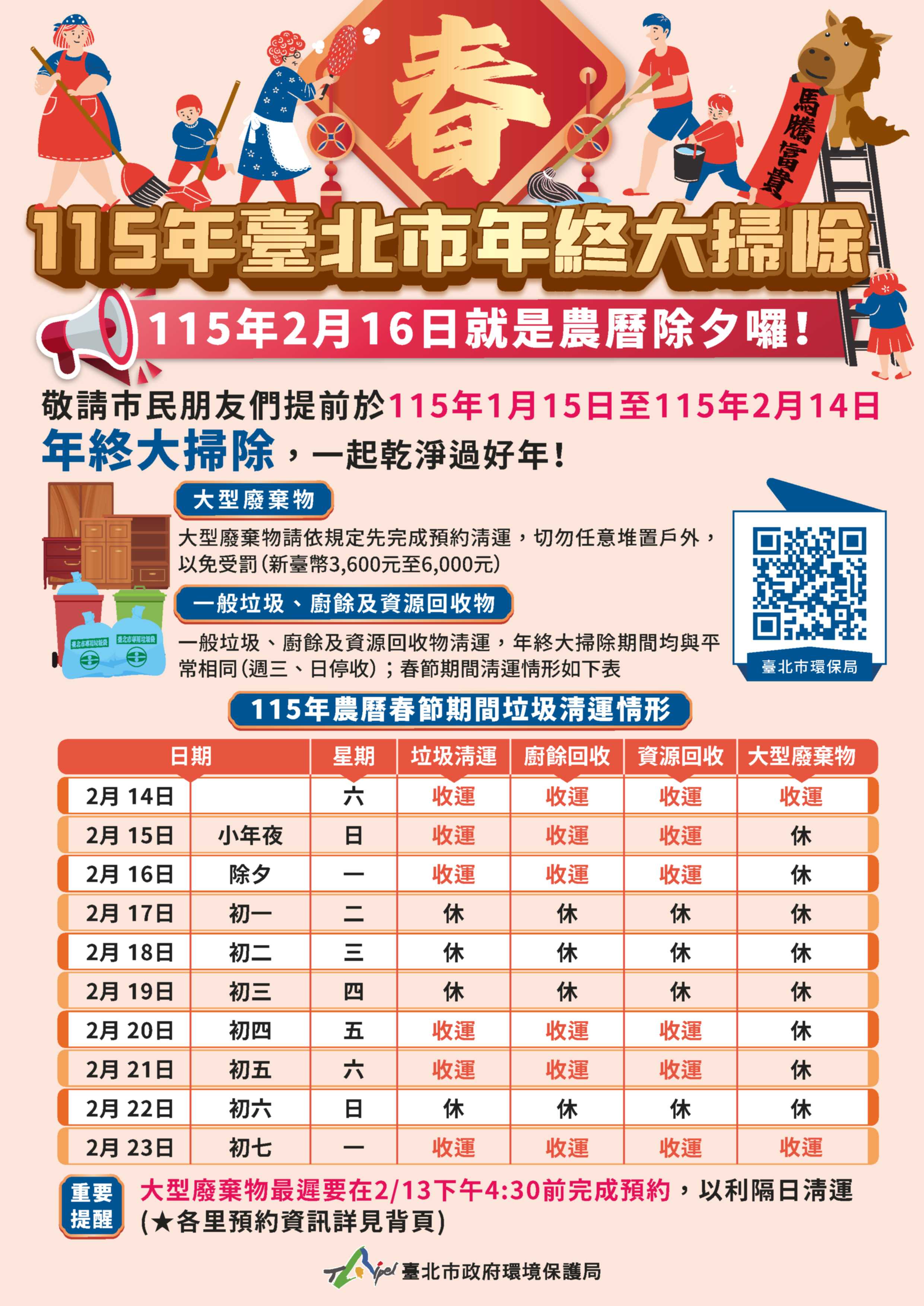 啟動年終大掃除!請提早清理居家環境並預約 清運大型廢棄物。廢行李箱、安全帽可交給資源回收車回收,請上臺北市環保局網站查詢。