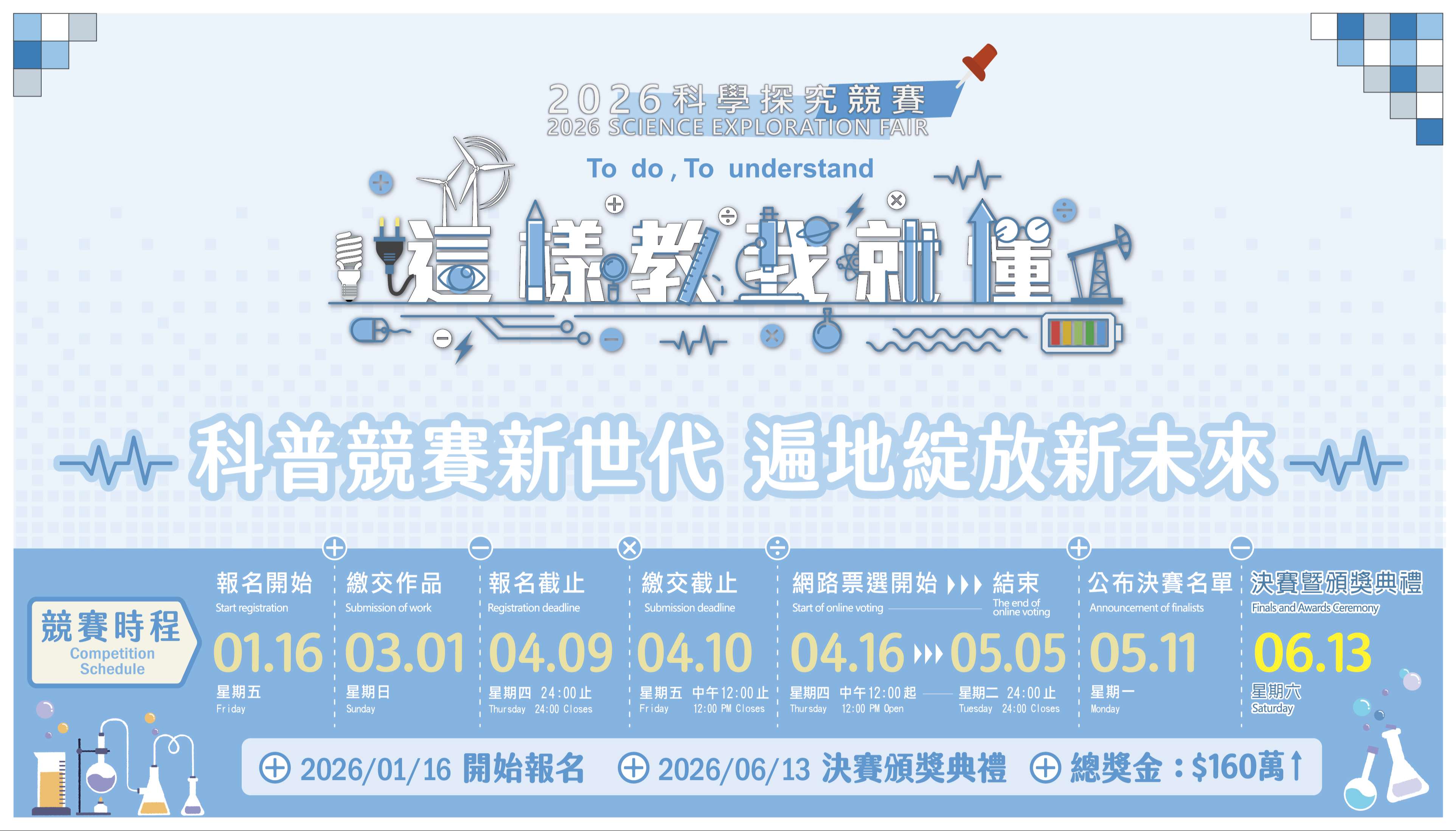八、報名資訊、競賽方式與獎勵等相關資料請參閱附件或計畫 網站(官網:https://sciexplore2026.colife.org.tw; 粉絲專頁:https://www.facebook.com /ScitechvistaFair)。相關事宜如有疑義,請逕洽本競賽 承辦人陳小姐,(電話:06-5050940分機661、電子信箱: sciexplore.tw@gmail.com)。