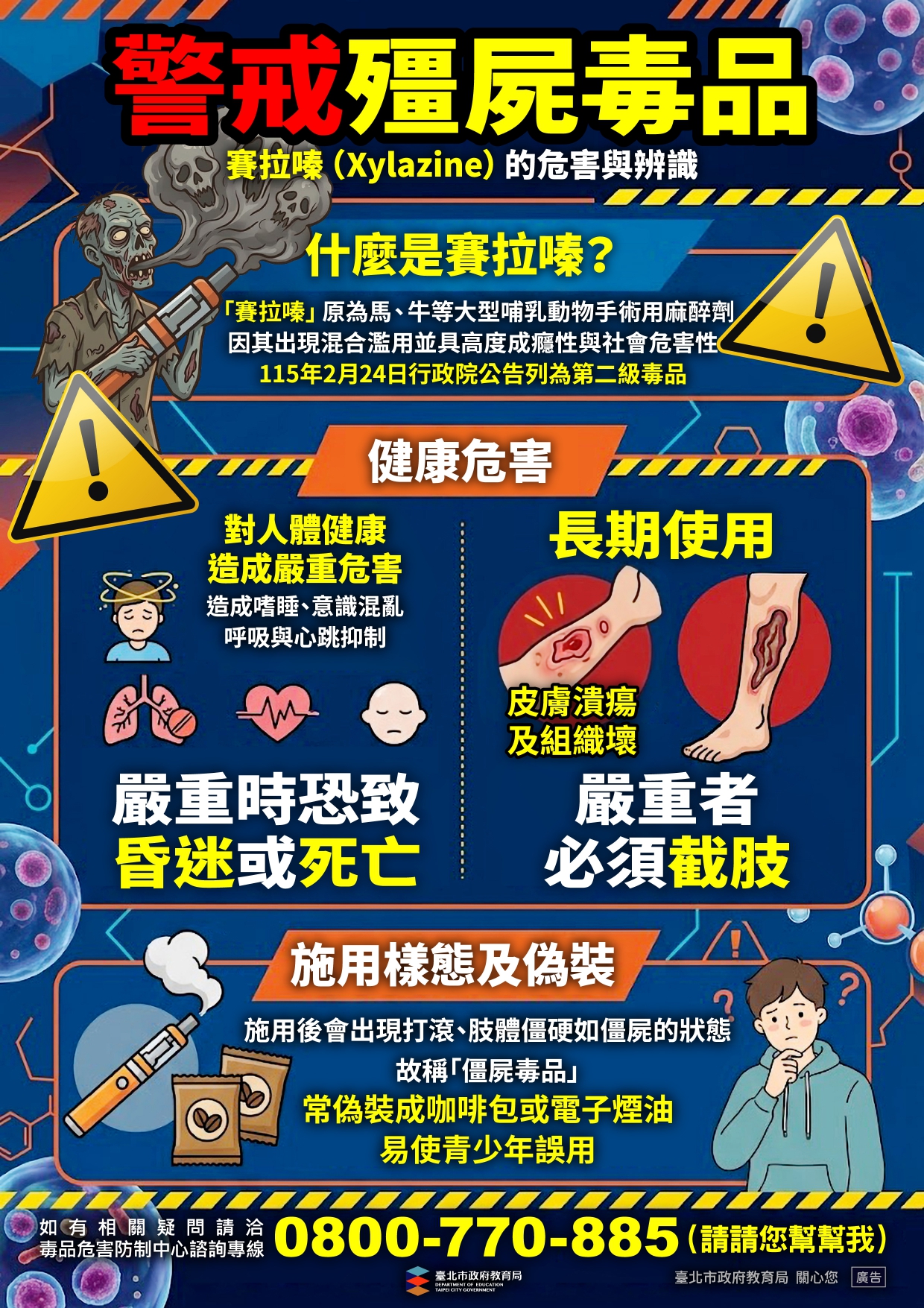 「賽拉嗪(Xylazine)」原為獸醫使用之麻醉藥物,近年遭濫用並常與其他毒品混合使用,施用後會出現打滾、肢體僵硬如僵屍的狀態, 故稱「僵屍毒品」。