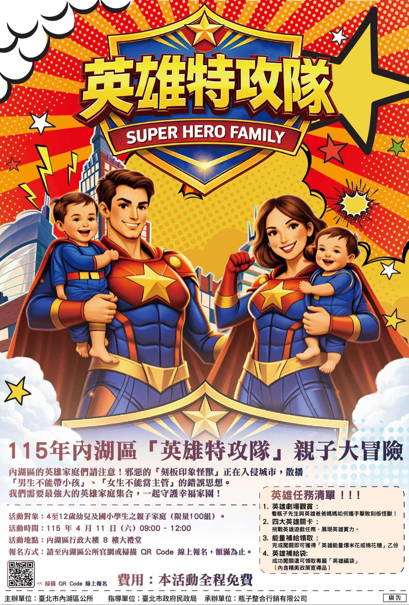 內湖英雄特攻隊徵召中!115年4月11日一起擊敗刻板印象怪獸。活動包含魔術劇場、英雄闖關摸彩及限 量能量補給甜點,帶孩子體驗不一樣的英雄特訓!詳情 及報名請上內湖區公所官網查詢,手刀報名去!