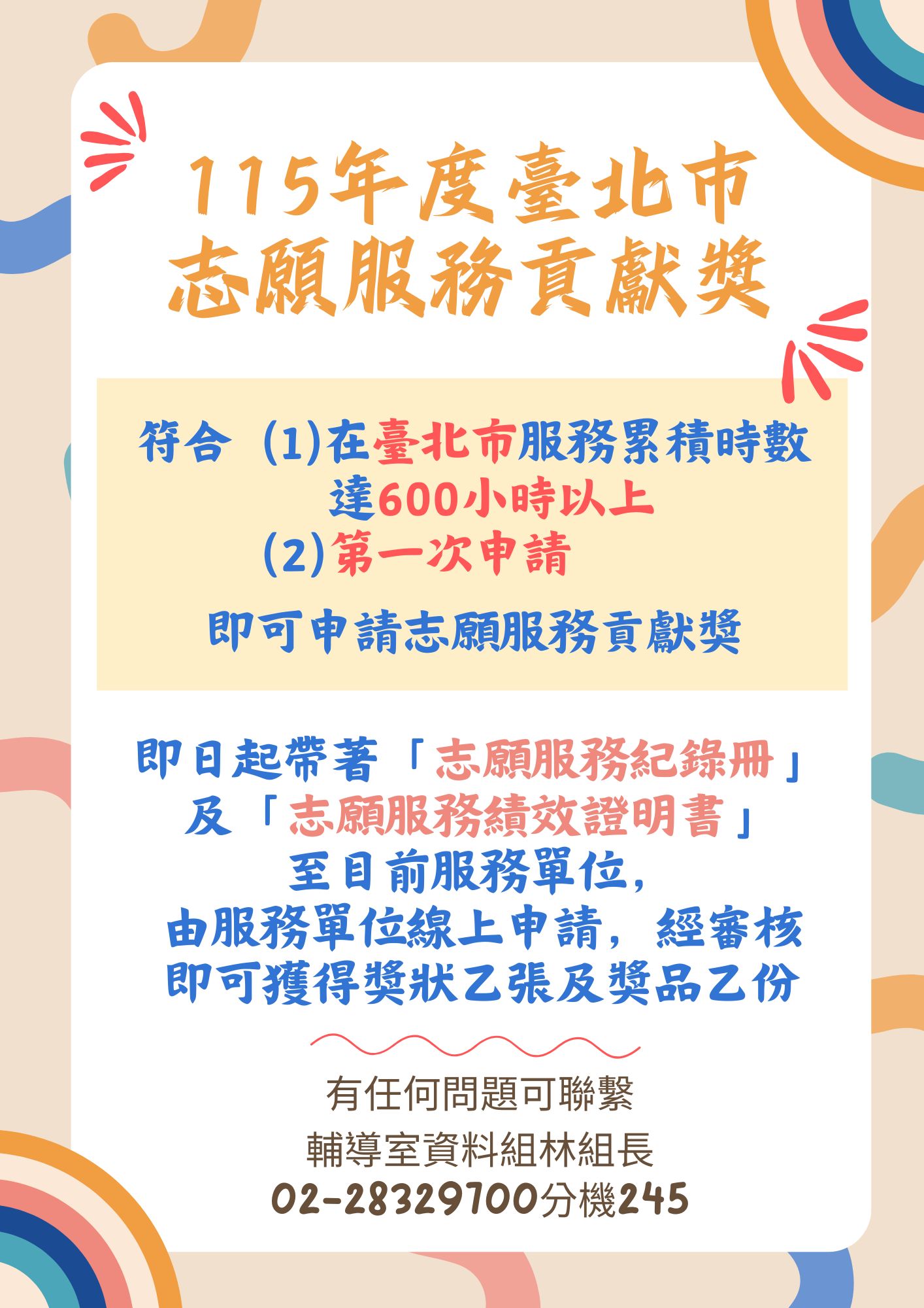 有任何問題可洽輔導室資料組林組長02-28329700分機245。