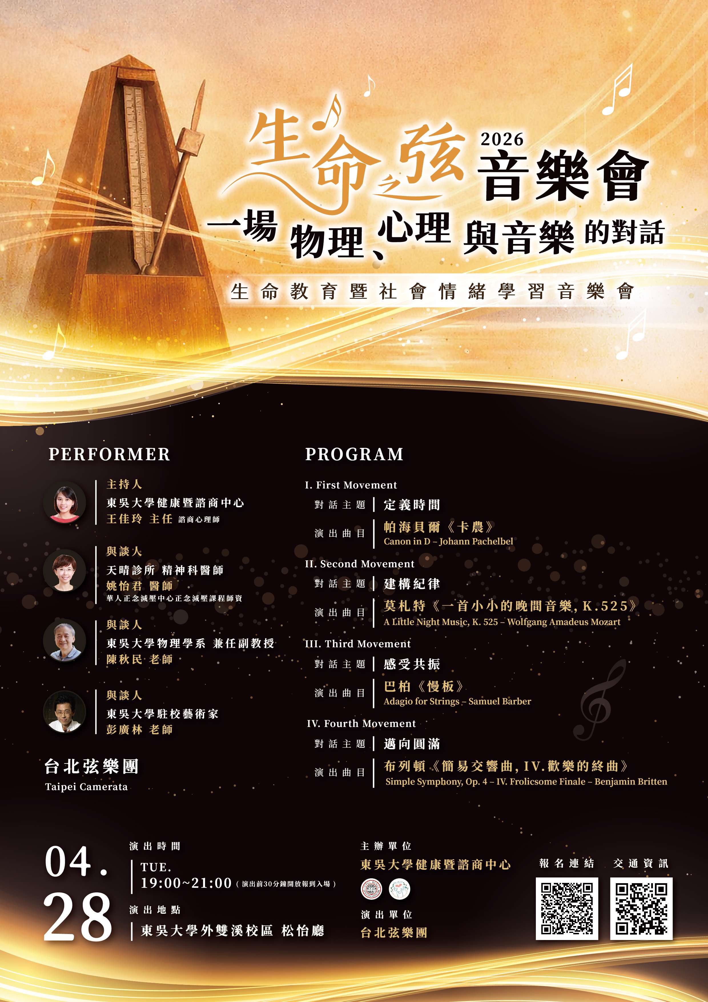 一、為推動生命教育並實踐社會情緒學習(SEL)之精神,謹訂於115年4月28日(星期二)舉辦旨揭音樂會。本次活 動特邀「台北弦樂團」擔綱演出,並透過物理、心理與音 樂之跨領域對話。