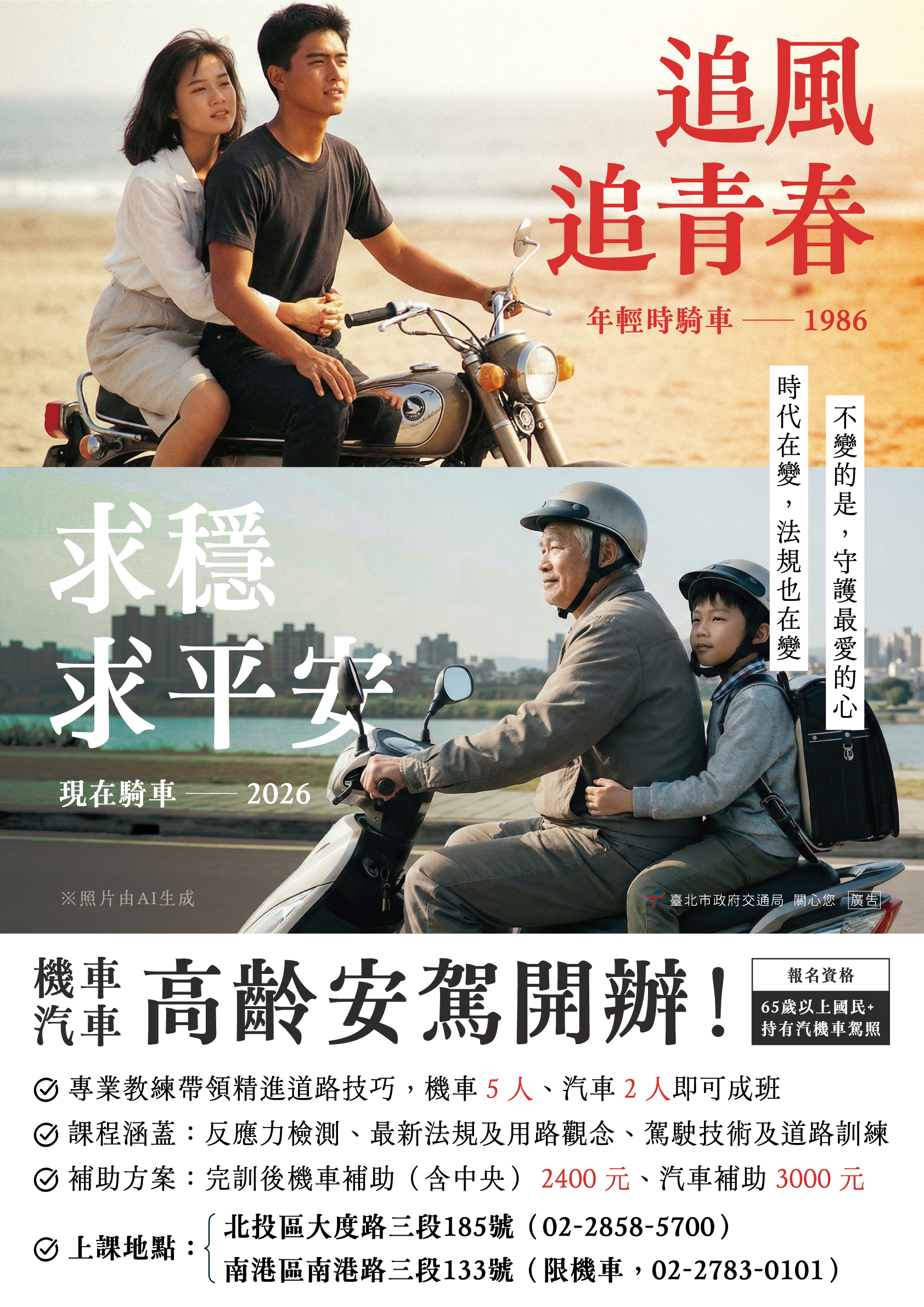 為提升高齡者交通安全意識及增進駕駛技能,交通局推動高 齡汽機車駕訓補助措施,鼓勵高齡民眾參與道路駕駛訓練課程,以降低交通事故風險。